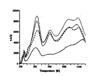 分析表明25℃下的反應只產生很小的變化,所以在低溫下HNO 3溶液主要以酸的形式反應,只對活性炭產生微小的改變。然而,在80℃下的活性炭反應顯示與HNO 3的氧化作用有關的主要變化,如活性炭中總表面基團的總體增加和羧基類似基團的最大形成。另外,由樣品的堿度降低可以解釋為6M硝酸溶液處理3小時后堿性基團的延長氧化的結果。圖2顯示了這些活性炭的TPD曲線,觀察到新峰的存在,給出了碳的化學組成的變化,即氧化基團的增量。硝酸改性碳的元素分析表明,由其他人觀察到,增加氮含量可以歸因于硝基(NO 2)形成的影響。